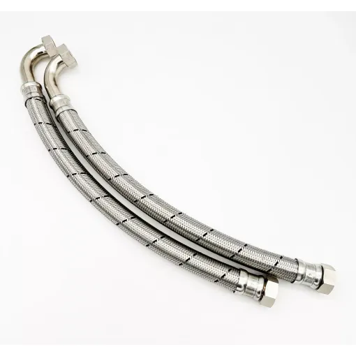 A pair of 1" BSP flexible stainless-steel hoses, 600mm in length with a 25mm bore. Each hose has one straight connector and one elbow connector, both with 1" BSP threaded ends.