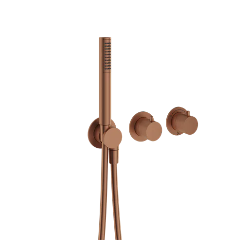 Introducing the luxurious Crosswater MPRO Brushed Bronze Module 3 Outlet 2 Handle Trimset & Handset. This stunning bathroom accessory is the perfect addition to your modern bathroom, offering both style and functionality.