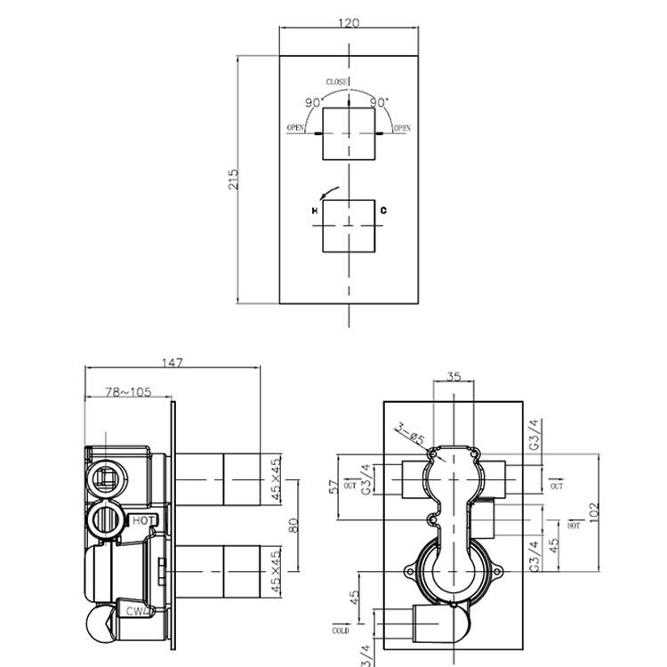 Crosswater Water Square Shower Valve With Diverter WS1500LBPC|WLBP1500RC+